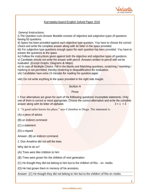 Karnataka Board English Class 10 Question Paper 2016 with Solutions - Free PDF Download