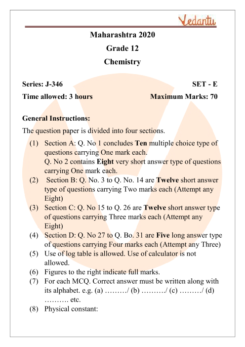 Class 12 Chemistry MSBSHSE Question Paper 2020 - Free PDF Download