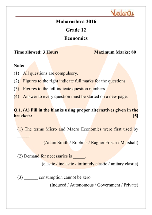 Class 12th is one of the most important junctions of a student’s life. It is the second time a student faces the Board Examination but has to think about what to pursue in life. It is an important juncture for the student in school life and in most cases, the Class 12th Board examination becomes the basis for the future careers of the students. Class 12th Board Examination results are also asked by all the institutions of higher learning and providing graduation and diploma degrees. The marks obtained by the students in Class 10 and Class 12 are asked for in well-known national level institutions like IIMs, national-level universities, Delhi Universities, etc. along with other requirements. Thus, it clearly shows how important Class 12th Board examinations are in a students’ life. But, this doesn't mean that students start taking pressure about the examination, instead prepare thoroughly for the examination and with hard work and patience, you can score good marks in the examinations. The MSBSHSE Class 12 Economics Question Paper 2016 pdf, and of other years is one of the attempts by Vedantu to help the students to prepare for Class 12th Board Examination of Economics Subject of Maharashtra State Board of Secondary and Higher Secondary Education Board.