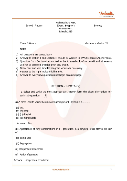 Maharashtra Board HSC Biology Class 12 Previous year Question Paper 2015 with Solutions - Free PDF Download