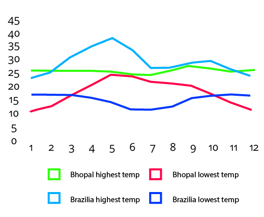 5. With the help of the internet, obtain information regarding the annual average temperatures of the continental location of Brasilia and Bhopal and explain it with the help of a graph.