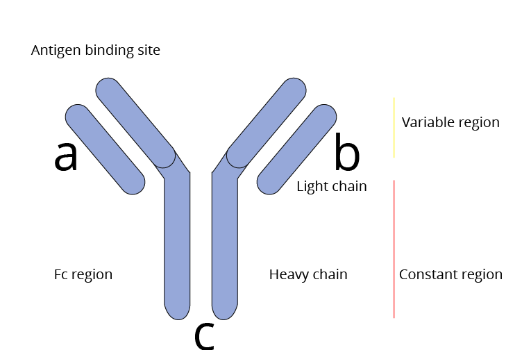 Antibody | Immunoglobulin | Antibodies recognize antigen and bind to it to attack it. The antibody is Y- shaped. It has two regions Fab (variable) and Fc (constant in every antibody). |