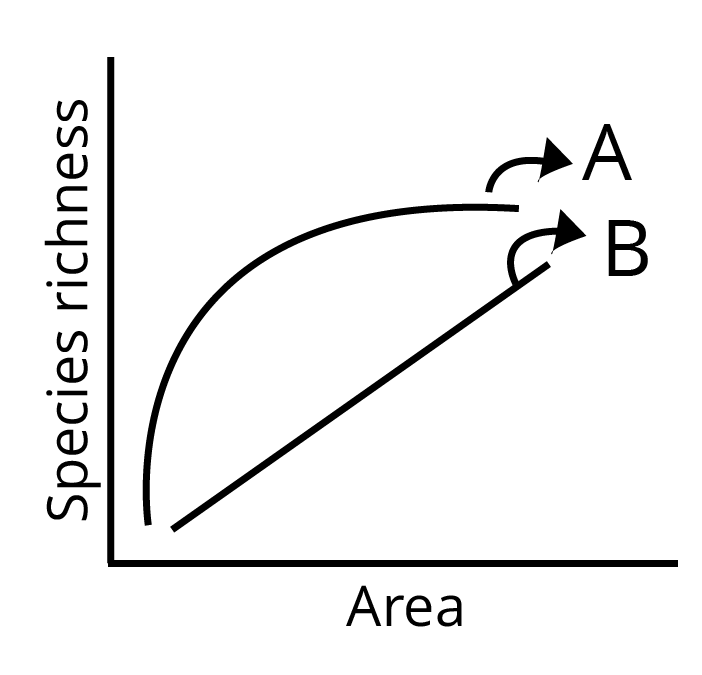 The graph shows the relationship between the species and the area. Alexander Von Humboldt studied this relationship and concluded that species richness increases with the area but up to some limit. The slope of the line is indicated by Z. When large areas are studied, the slope of line A becomes steeper.