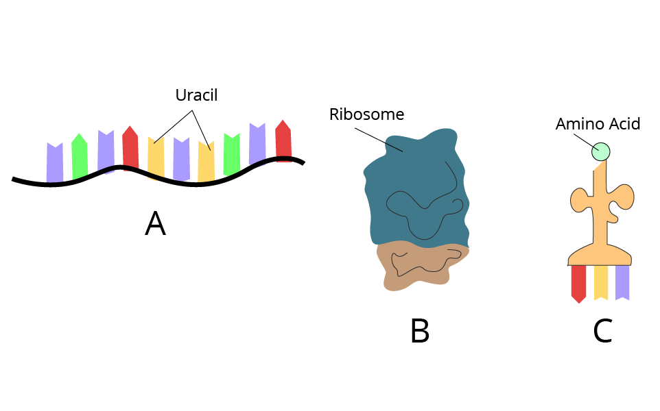 Part B is the amino acid: During the process of translation, the ribosome binds to the mRNA sequence and reads the code. Accordingly, the ribosomes add the amino acids and thus, the synthesis of proteins takes place.