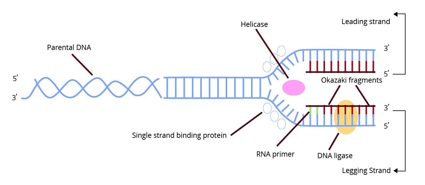 Elongation: During the elongation phase, the Okazaki fragments are formed because of the unidirectional nature of DNA polymerase. It can synthesise the DNA strand in 5'to 3' direction. Thus, two strands are formed, one is the leading strand which is continuous and the other is the lagging strand which is discontinuous. The enzyme ligase joins the Okazaki fragments.