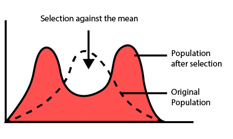 Ans: The natural selection that leads to disruptive change is called disruptive natural selection. In disruptive natural selection, nature favors extreme traits and disfavors intermediate traits. Consequently, the individuals having intermediate traits get declined while the individuals having extreme traits get increased. For example- industrial melanism due to which the population of white moths declined while the population of black moths increased.