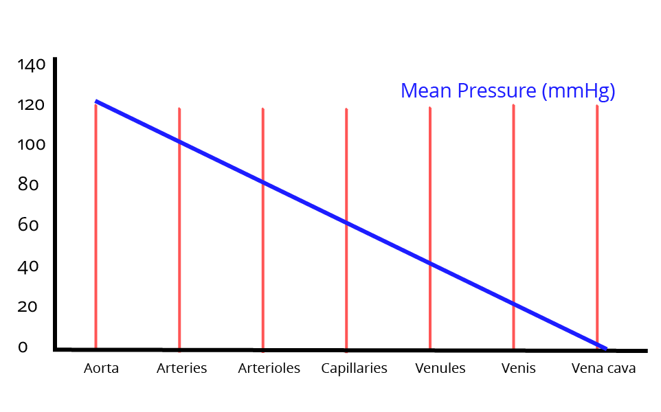 When the heart pumps, the blood pressure is highest in the aorta and lowest at the vena cava.