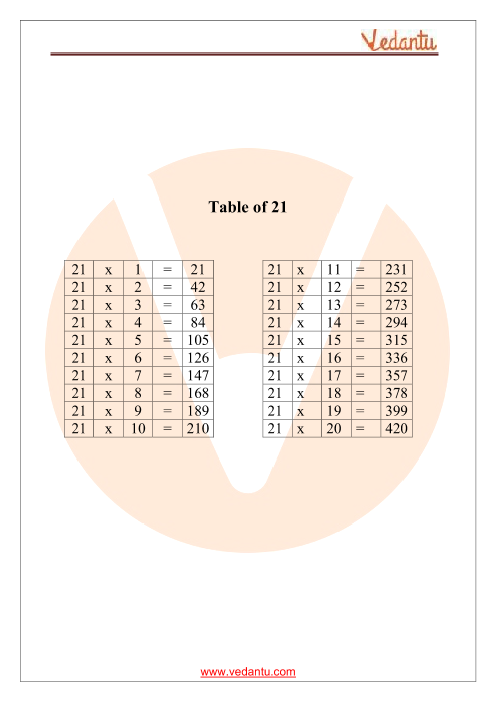 The table of 21, also known as the 21 times table or the multiplication table of 21, lists the products obtained by multiplying 21 by whole numbers. It's a fundamental concept in mathematics, helping students develop multiplication skills and understand patterns in numbers. Learning this table aids in quicker calculations and problem-solving.