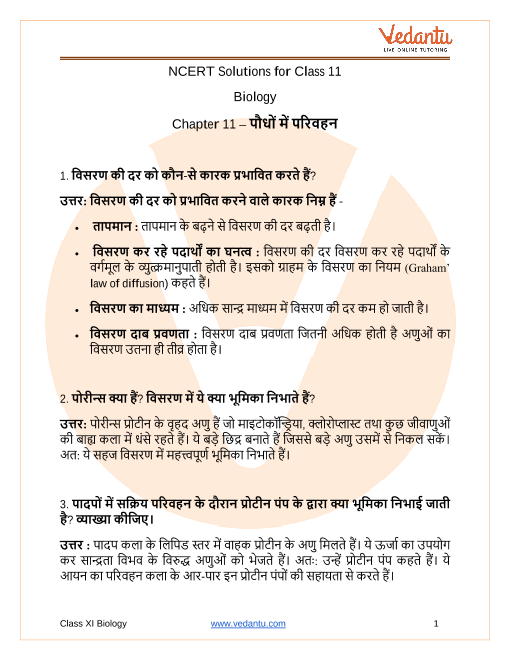 FAQs on NCERT Solutions For Class 11 Biology Chapter 11 Transport In Plants in Hindi - 2025-26