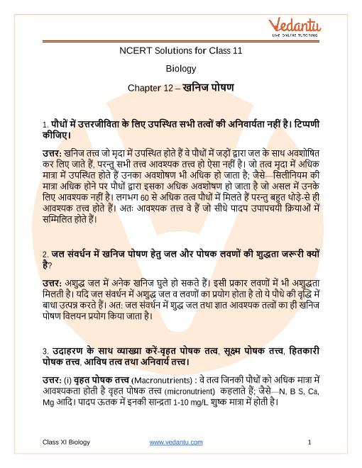 Table of ContentIf you sometimes feel stuck on plant nutrition or get mixed up with terms like macro and micronutrients, these NCERT Solutions from Vedantu will clear up your doubts. The step-by-step solutions—even available as a handy downloadable PDF—are written in simple language so you can study at your own pace. To explore the full Class 11 Biology syllabus, check out the Class 11 Biology Syllabus.