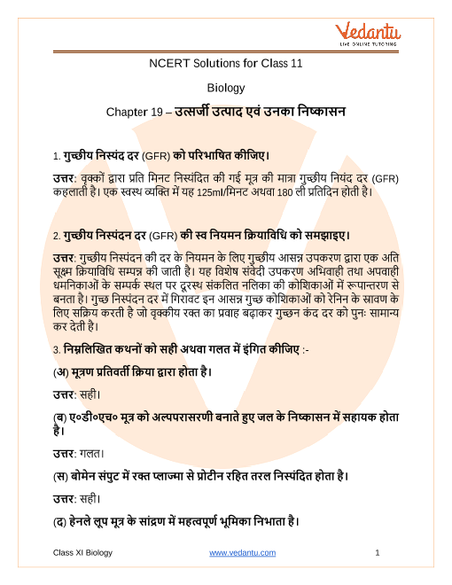 NCERT Solutions For Class 11 Biology Chapter 19 Excretory Products And Their Elimination in Hindi - 2025-26