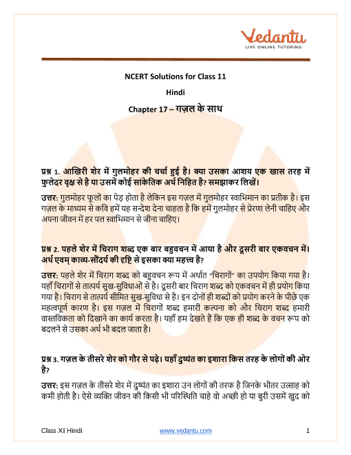 You can get the Online NCERT Solutions of Class 11 Hindi Aroh Part One for FREE on the Vedantu website, along with the downloadable PDFs. You can either refer to these solutions online or download the PDF Solutions to refer offline, according to your convenience. At Vedantu you will find proper explanations for all the topics. These solutions are thoughtfully prepared by a group of experts and are presented in a very simple manner for easier understanding.