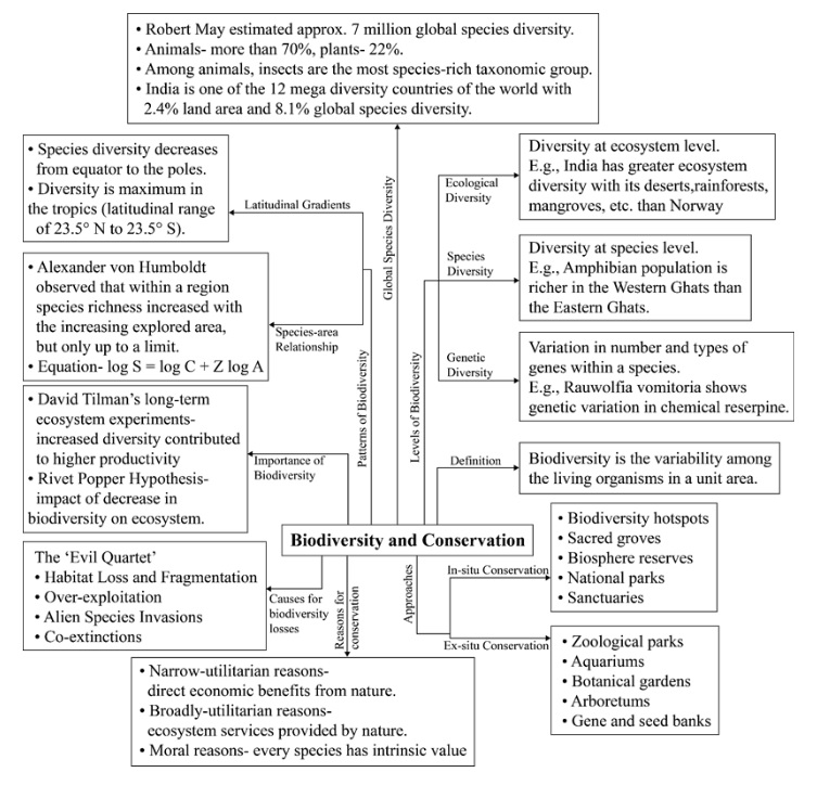 - Detailed explanations of conservation strategies, including in-situ (like National Parks, Sanctuaries, Sacred Groves) and ex-situ conservation (like Zoological Parks, Botanical Gardens).