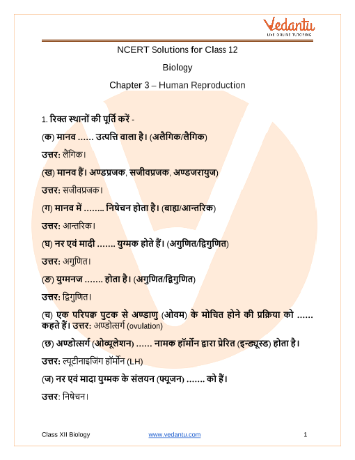 FAQs on NCERT Solutions For Class 12 Biology Chapter 3 Human Reproduction In Hindi Medium in Hindi - 2025-26