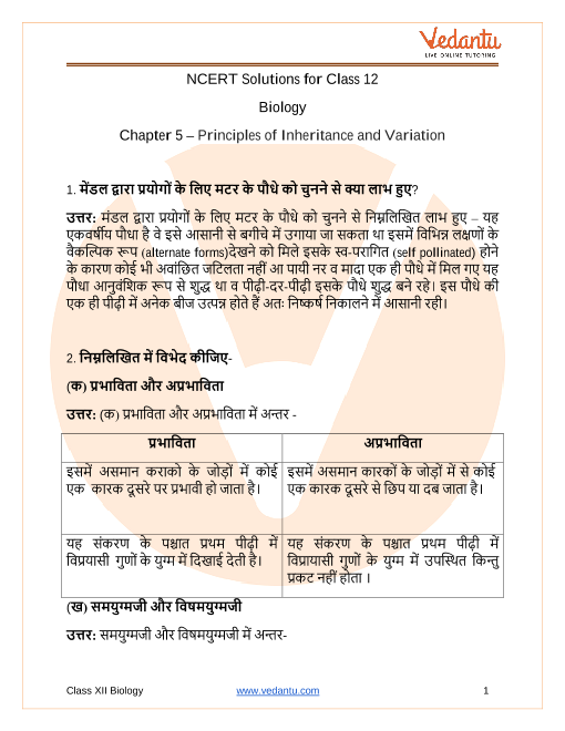 Solved NCERT Questions For Class 12 Biology Chapter 5 In Hindi - Free PDF