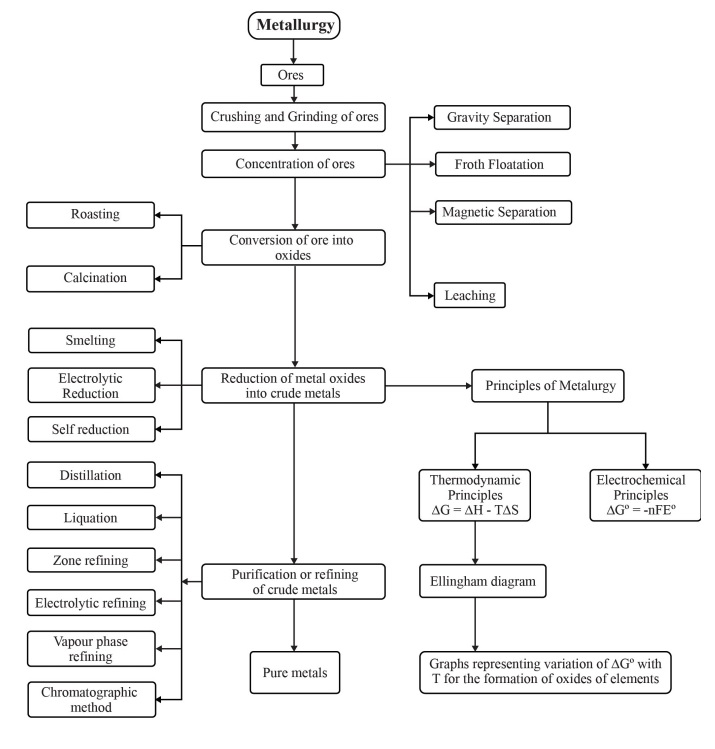 - Extraction of Crude Metal: Processes like calcination, roasting, and the application of thermodynamic principles (Ellingham diagram).