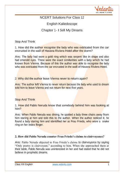 Vedantu’s NCERT Solutions for Class 12 English Kaleidoscope Short Stories Chapter 1-I Sell My Dreams will guide students during their revision process with the least effort. It is our advice that students go through these solutions and practise them after having completed a summary of the chapter from the textbook to attempt the Class 12 English board exam with the confidence of scoring higher marks.