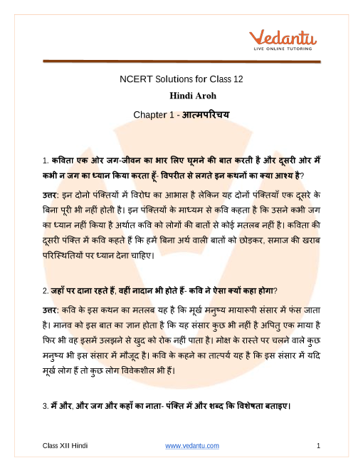FAQs on NCERT Solutions For Class 12 Hindi Aroh (Poem) Chapter 1 Aatmaparichay, Ek Geet - 2025-26