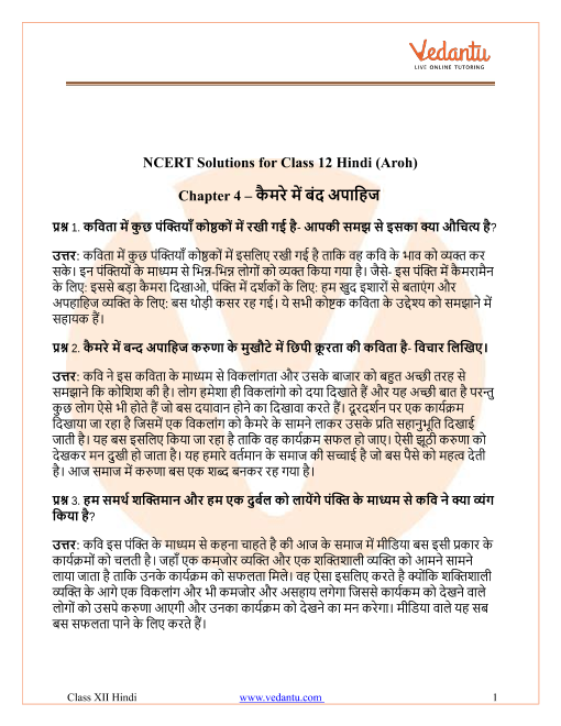 FAQs on NCERT Solutions for Class 12 Hindi Aroh Poem Chapter 4 Camere Mein Band Apahij