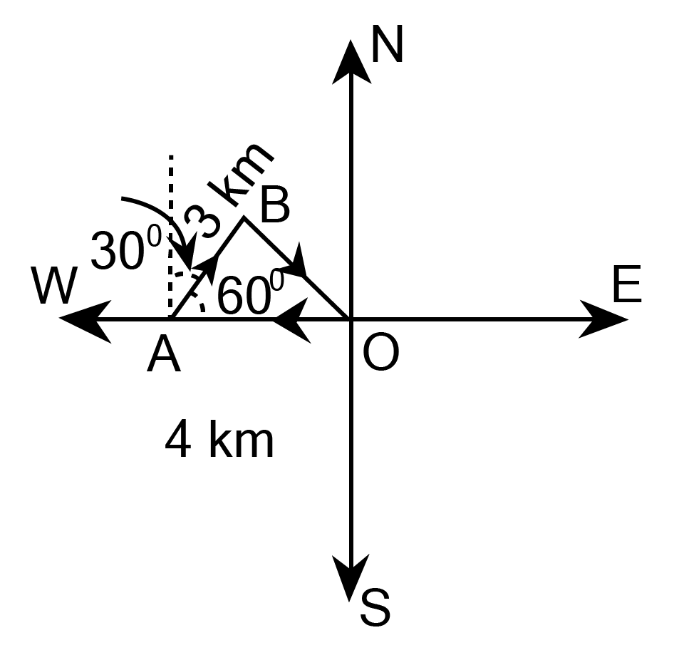 3. A girl walks 4 km towards the west, then she walks 3 km in a direction ${30^\circ }$ east of north and stops. Determine the girl's displacement from her initial point of departure.