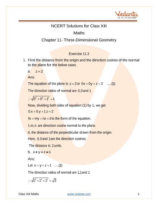 The solutions first identify the normal vectors from the plane equations and then substitute them into this formula.10. What approach do the NCERT solutions suggest for problems in the Miscellaneous Exercise of Chapter 11?