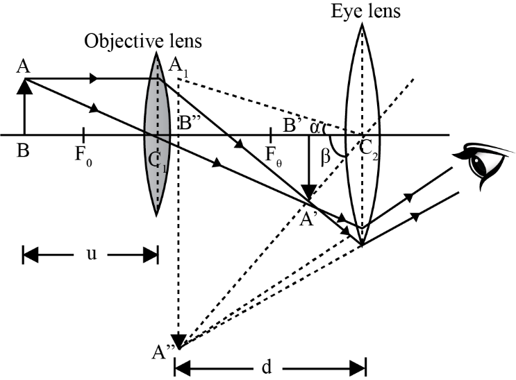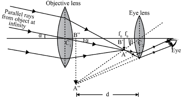 Where fo and fe are the focal lengths of the objective and eyepiece, respectively, and L is the distance between their focal points.