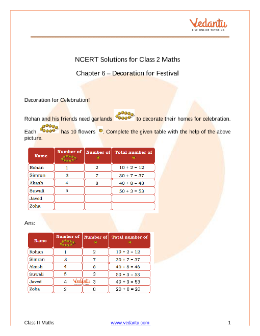 NCERT Solutions for Class 2 Maths Chapter 6 use activities like festival decorations, counting garlands or flowers, and money spent at fairs to illustrate math applications, making learning both fun and relevant to everyday life.