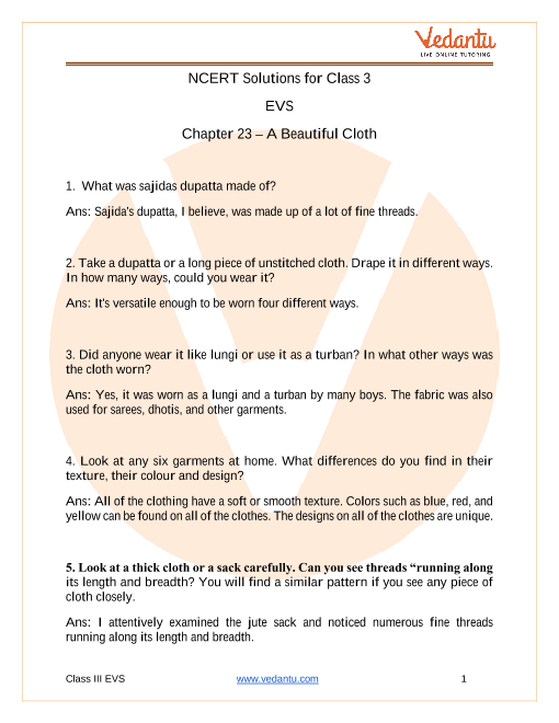 he beautiful cloth mentioned in the NCERT Class 3 EVS Chapter 23 is nothing but a beautiful dupatta that Sajida’s sister had gifted to her. She was very happy and pleased on receiving the dupatta. It was indeed a beautiful piece with beautiful and intricate embroidery. Sajida often wondered how this beautiful piece of cloth was made. What follows is the base of the chapter.