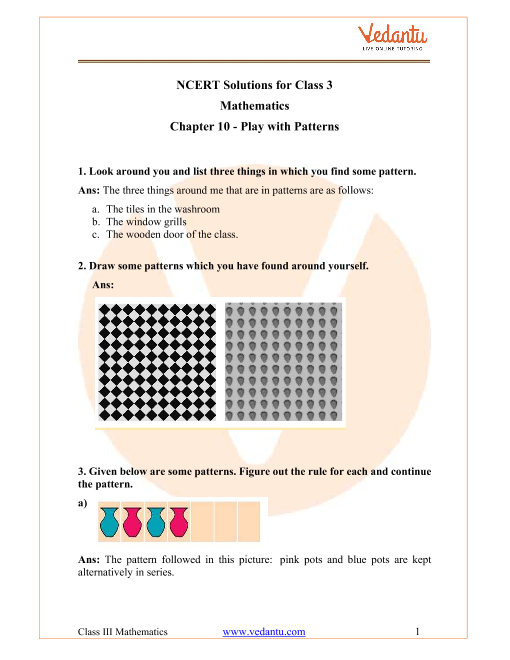 - NCERT Solutions for Class 3 Maths Chapter 10 include activities on identifying, extending, and making patterns using shapes, colours, and numbers.