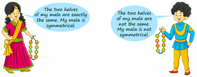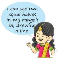A line of symmetry divides a shape or design into two mirror-image halves. Chapter 14 teaches students to identify such lines by folding paper or visually matching both sides of a figure, using examples like gates, beads, and rangoli designs.