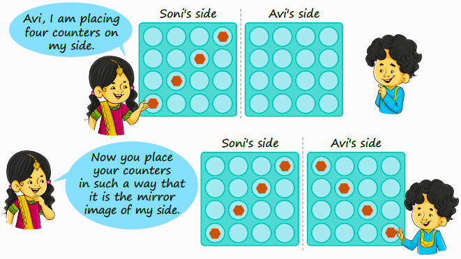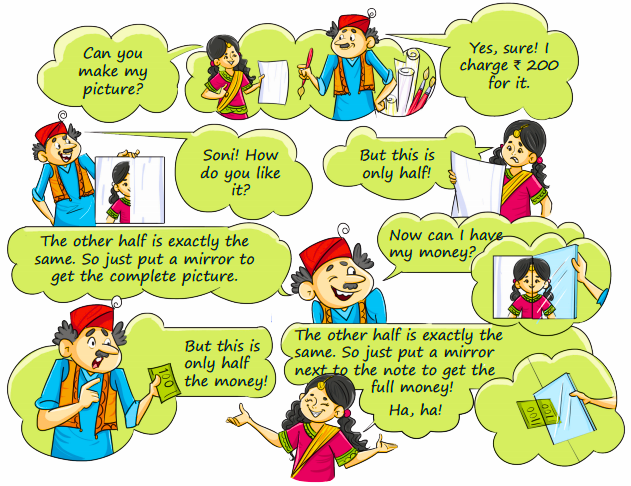 Chapter 14 introduces symmetry by asking students to find lines that divide an object or design into two identical halves, often using real-life examples from the fair such as gates, patterns, and rangolis. Students also practice drawing and folding designs to visually check symmetry, as per the CBSE 2025–26 syllabus.