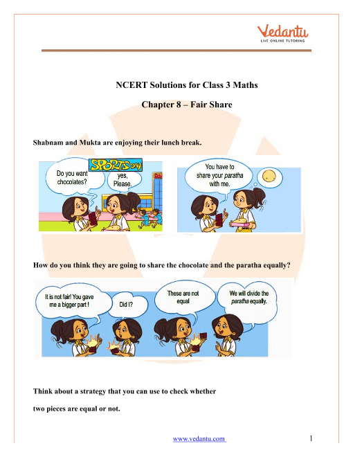 NCERT Solutions for Class 3 Maths Chapter 8 Fair Share provide clear, stepwise answers to all textbook questions, focusing on fair sharing, halves, quarters, and division of objects. The solutions ensure students understand equal distribution using simple methods and real-life examples, aligning with the CBSE 2025–26 syllabus.