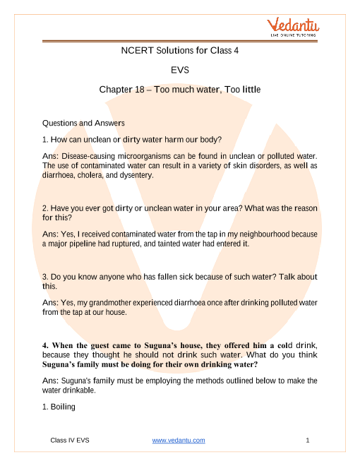 The importance of water in our lives is taught in NCERT Solutions for Chapter 18 -Too Much Water Too Little Water of Class 4 EVS. Without water, we would perish. As a result, it is important to use water with caution. We must not squander any water. At the same time, it's critical to understand that the water we drink should be pure and safe. Water that is contaminated can cause a variety of illnesses and harm to our health. There are ways to purify and disinfect our drinking water.