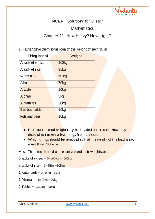 In Class 4 Maths Chapter 12 - "How Heavy? How Light?", we dive into the exciting world of weights! Get ready to explore and compare the heaviness and lightness of different things. We'll use scales, discover units like kilograms and grams, and have fun with practical activities. Let's make learning about weight super cool! Vedantu provides NCERT Solutions for Class 4 Maths Chapter 12 How Heavy? How Light? in the PDF format for free download by students. Every sum given in the exercise of the NCERT Class 4 Maths Chapter 12 is solved and explained in these NCERT Solutions in a detailed stepwise manner. By referring to these NCERT Solutions students can get a better understanding of the concept of weights. With the help of the NCERT Solutions for Class 4 Maths Chapter 12 How Heavy? How Light? students can prepare this chapter for their exams more effectively.