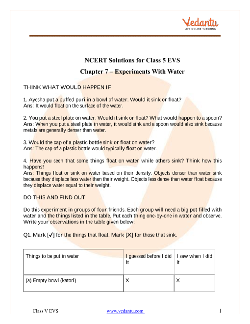 NCERT Solutions For Class 5 Evs Chapter 7 Experiments With Water - 2025-26