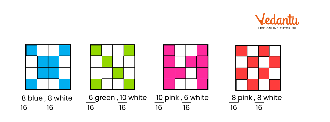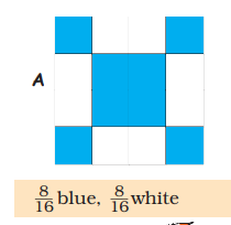 b) $\dfrac{2}{4} blue, \dfrac{2}{4} white =\dfrac{8}{16}= \dfrac{2}{8}$ ....(divide both denominator and numerator by 2)