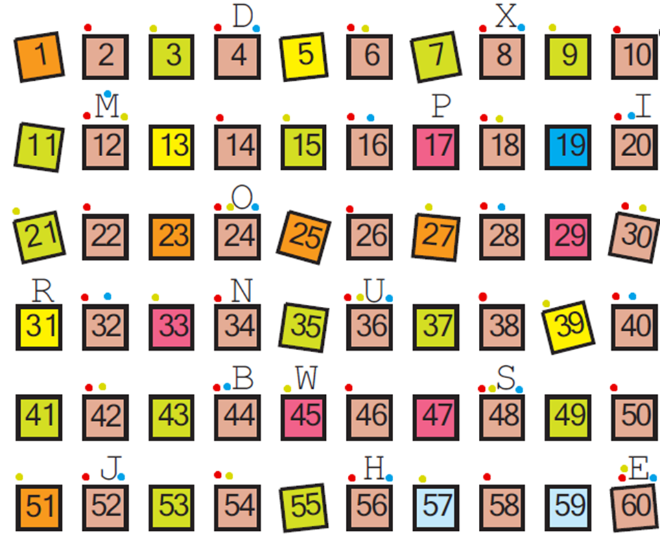 Ans. The boxes with dots of all three colours are 12, 24, 36, 48, and 60.