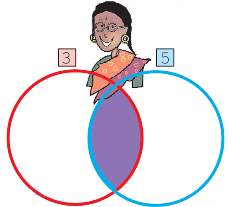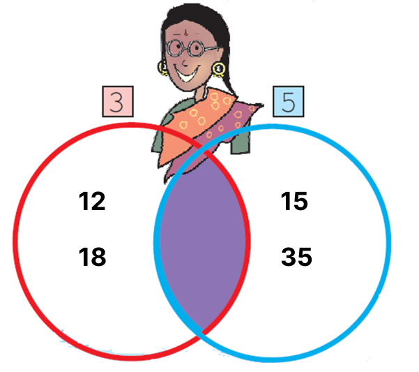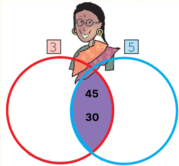 (b) Some numbers are multiples of both 3 and 5. So we can say that they are both 3 and 5. Think! If you write the multiples common to 3 and 5 in the purple part, then will they still be in both the red and the blue circles?
