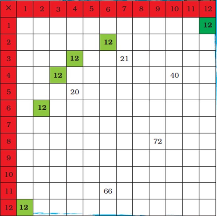 Look at the green boxes in the chart. These show how we can get 12 by multiplying different numbers.