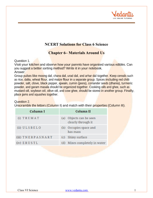 FAQs on NCERT Solutions For Class 6 Science Chapter 6 Materials Around Us