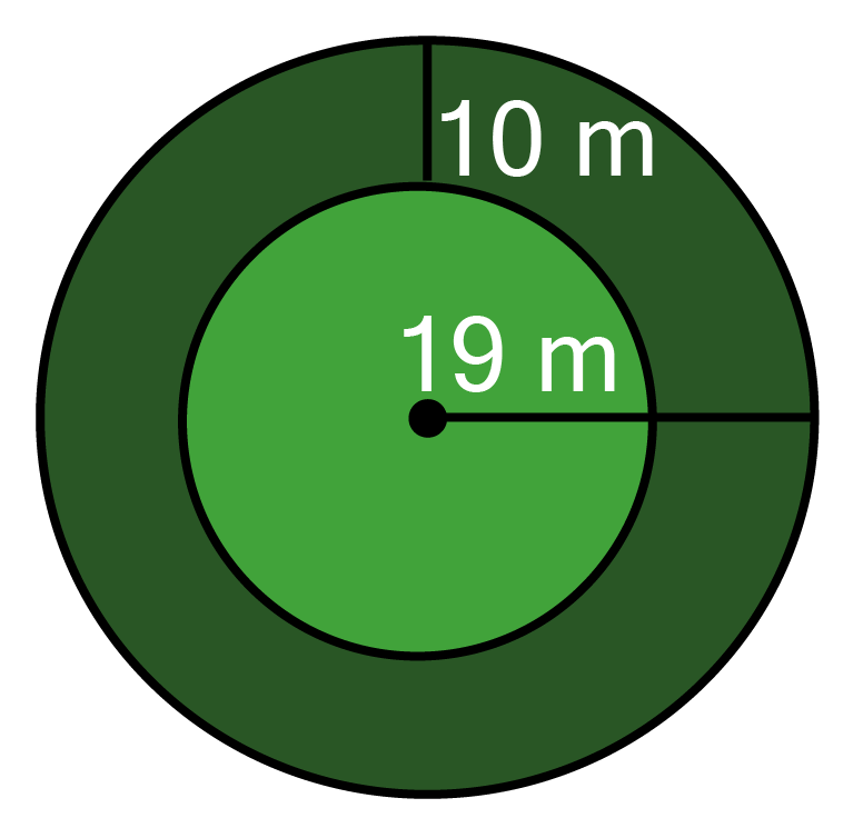 Now, radius of the inner circle(r`) $ = {\text{ 19 - 10 = 9 m}}$
