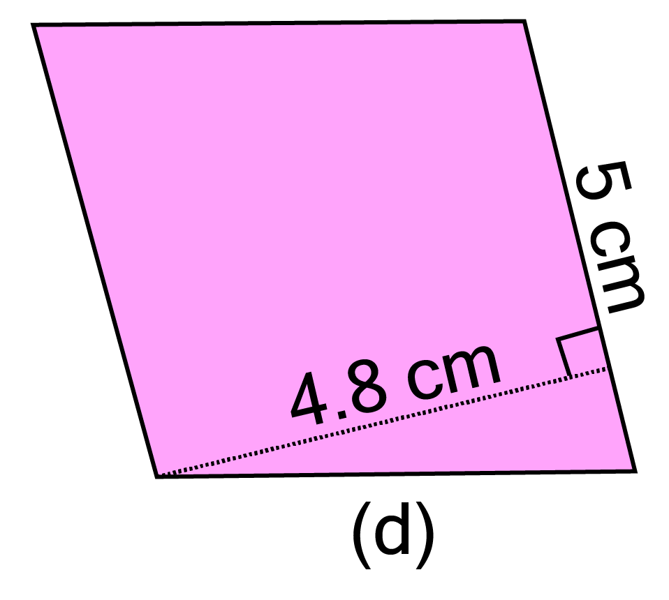 $\therefore $ Area of parallelogram ${\text{ = 5 x 4}}{\text{.8 = 24 c}}{{\text{m}}^2}$