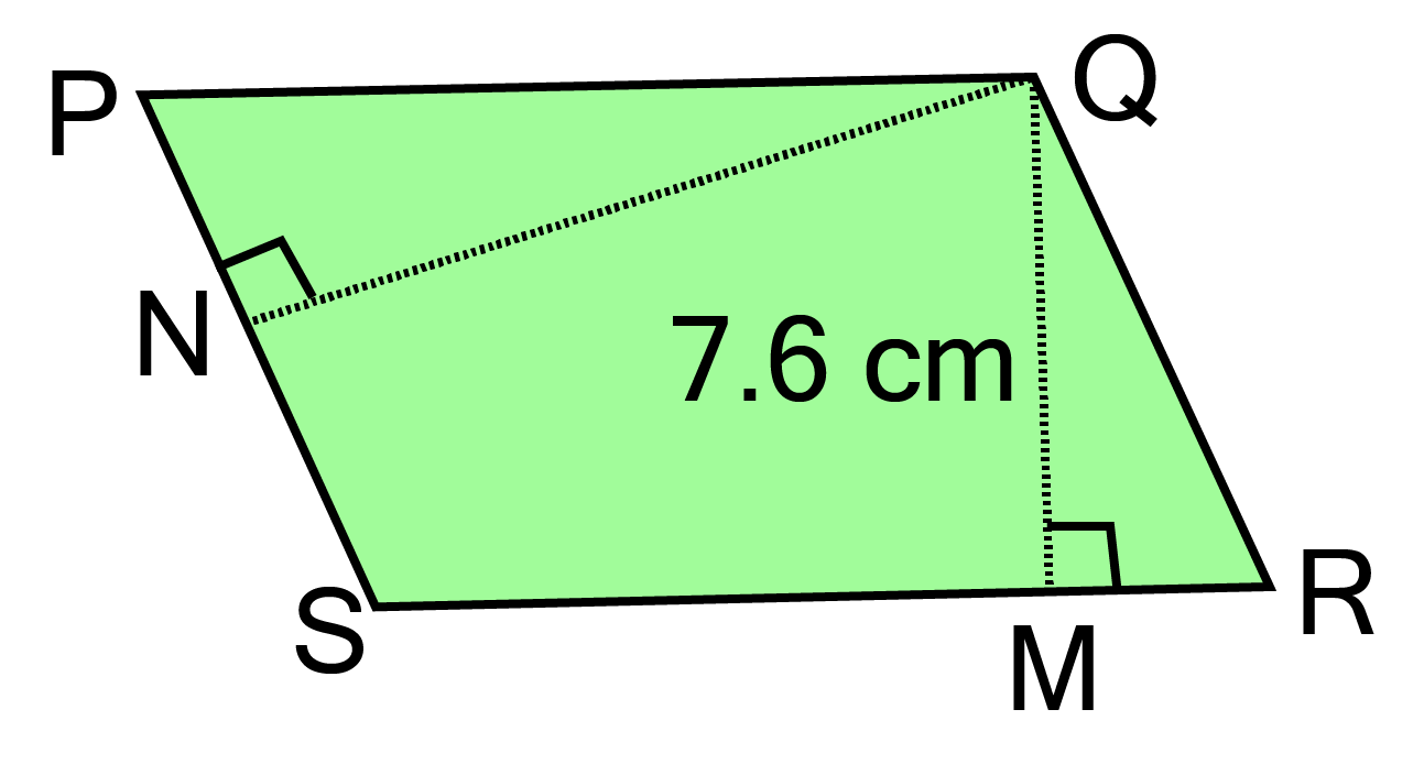 5. PQRS is a parallelogram. QM is the height from Q to SR and QN is the height from Q to PS. If SR ${\text{ = 12 cm}}$ and QM ${\text{ = 7}}{\text{.6 cm}}$.