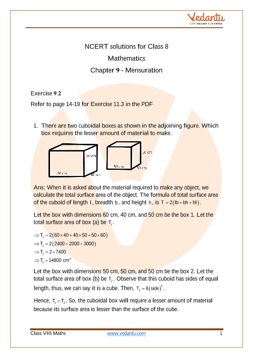 The shape with the lesser surface area requires less material. This is because surface area determines the outer covering needed. In Exercise 9.2, comparing a cube and cuboid of equal volume but different dimensions illustrates how shape affects material usage, a key learning outcome in NCERT Solutions for Class 8 Maths Chapter 9 Mensuration.