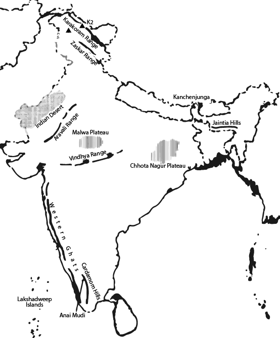 Clearly identify the specific features asked in the NCERT exercise, such as mountain ranges (the Karakoram, the Zaskar), peaks (K2, Kanchenjunga), plateaus (Deccan), and coastal plains.