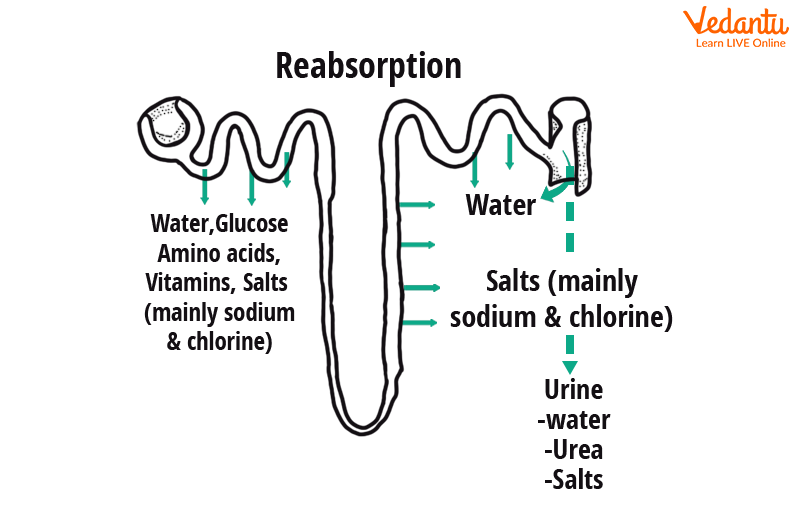 The reabsorption process takes place mostly in the renal tubules (the proximal convoluted tubule (PCT), a loop of Henle, and the distal convoluted tubule (DCT). This is where 99% of the filtrate is produced. It refers to the return of substances from the filtrate (in the nephron) to the blood circulation (of peritubular capillaries). Urea, uric acid, and creatinine are nitrogenous wastes that are not reabsorbed. This is an active as well as a passive process.