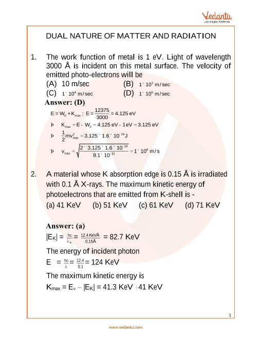 The NEET Dual Nature of Matter and Radiation Important Questions available on this page have been compiled by experts in the subject matter who have carefully studied the exams of the previous years to find out the kind of questions that normally appear in the exam. By downloading these important questions, you can get an idea of the kind of questions to expect in the exam as well as the kind of answers that the examiners want from you. Vedantu has also gone a step further and provided example answers to all of the questions in the list, with a simple explanation of how to arrive at the correct answer. By comparing your answers to those provided by Vedantu, you can adjust your study schedule and make corrections accordingly.