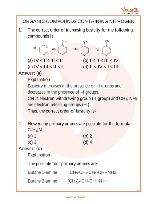 Vedantu is a great online platform for all the solutions of important questions related to Organic Compounds Containing Nitrogen. Students are sceptical of relying on online sources but Vedantu is 100 percent accurate and trustworthy. The solutions are prepared by subject experts who keep the students' thought processes and thinking in mind while creating these solutions. The solutions are available in PDF format for free and can be accessed by the students anytime anywhere. The solutions are of great help because if the students feel stuck anywhere they can just look at these solutions online on the Vedantu website.