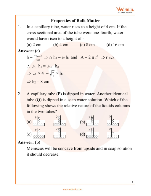 The Important Questions about the Properties of Bulk Matter are useful for the students. This chapter is quite lengthy chapter and has a lot of formulae and equations. It will be difficult for the students to remember every formula and equation of it. So if there are Important Questions available, students will get an idea of how questions are asked from this chapter, and how their preparation should be? and is it necessary to memorise all the formulae? Basically, students will understand what they can expect from this chapter in the main NEET Exam. Students can get the PDF from the Vedantu website. They can freely download the Important Questions from the website and make use of it.