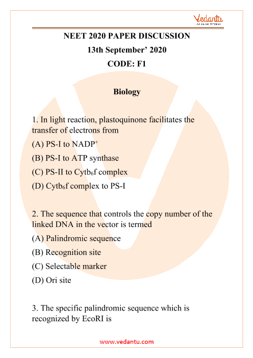The question paper for NEET 2020 F1 can be easily downloaded from the official website of Vedantu. Students will have to provide their username and password to download the PDF version of the question paper.